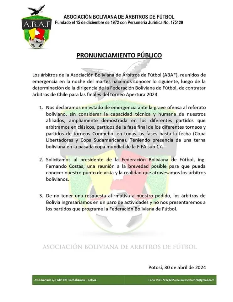 “Los árbitros de la Asociación Boliviana de Árbitros de Fútbol (ABAF), reunidos de emergencia en la noche del martes, hacemos conocer lo siguiente luego de la determinación de la dirigencia de la Federación Boliviana de Futbol, de contratar árbitros de Chile para las finales del torneo Apertura 2024”, sostiene el comunicado.