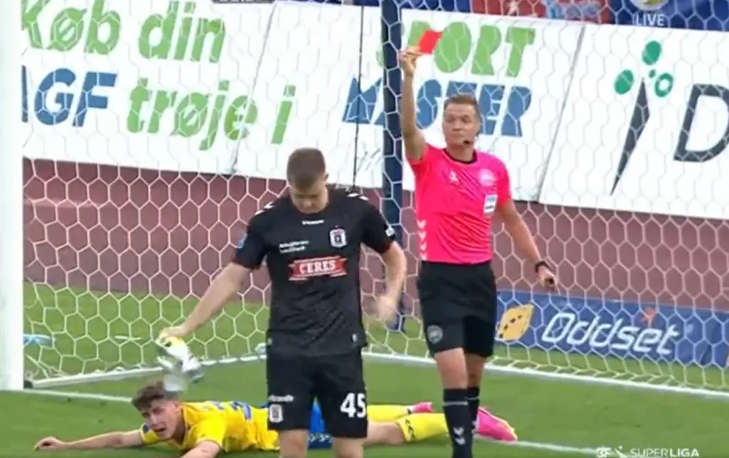 El arquero que estuvo a punto de darle a Darío Osorio su primer gol en el fútbol de Dinamarca sufrió una expulsión insólita. El norirlandés Bradley Peacock-Farrell dejó dos errores importantes en el duelo ante el FC Midtjylland del “11” ex Universidad de Chile.