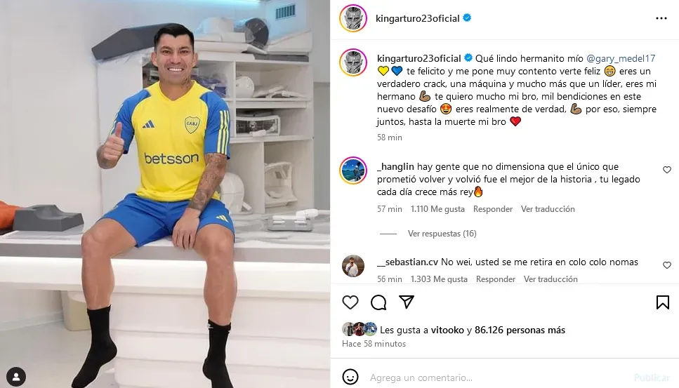 “Qué lindo hermanito mío @gary_medel17 te felicito y me pone muy contento verte feliz eres un verdadero crack, una máquina y mucho más que un líder, eres mi hermano te quiero mucho mi bro, mil bendiciones en este nuevo desafío eres realmente de verdad, por eso, siempre juntos, hasta la muerte mi bro ❤️”, (sic) escribió Vidal en Instagram.