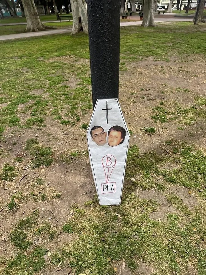 En los ataúdes aparece la imagen de Ulises Fernández, asesinado en 1997 en medio de una pelea entre barras de San Lorenzo y Huracán cerca del Nuevo Gasómetro. También está la foto de Rodrigo Silvera, alias Cafú, quien murió en 2008 luego de otro enfrentamiento.