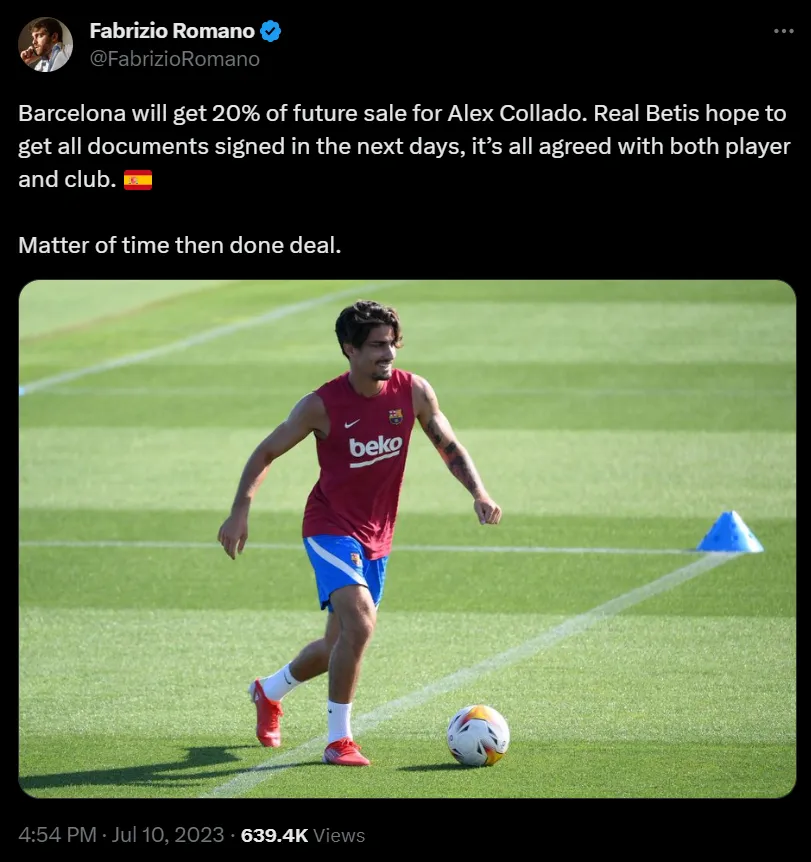 “Barcelona se quedará con el 20 por ciento de una futura venta”, informó el comunicador italiano a través de su cuenta de Twitter. “El Real Betis espera tener todos los documentos firmados en los próximos días”, añadió Romano.