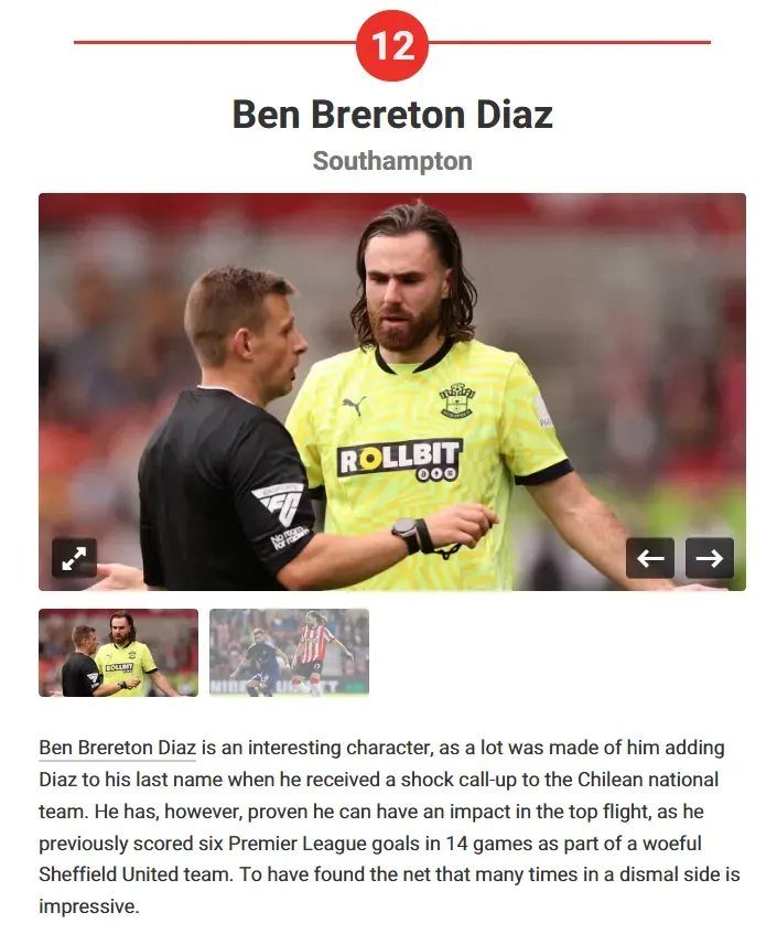 Ocupando el puesto número 12, el citado medio lo destaca de la siguiente forma. “Ben Brereton Díaz es un personaje interesante. Ha demostrado que puede tener un impacto en la máxima categoría, ya que anteriormente marcó seis goles en 14 partidos con un equipo decepcionante, el Sheffield United. No alcanzó esos estándares en el Southampton”, comentaron.