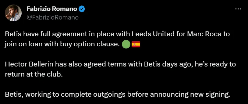 Así al menos lo informó Fabrizio Romano, el periodista que se especializa en el reporteo del mercado de pases. “El Betis tiene un completo acuerdo con el Leeds United para que Marc Roca se incorpore cedido con una opción de compra”, publicó el comunicador italiano en sus cuentas.