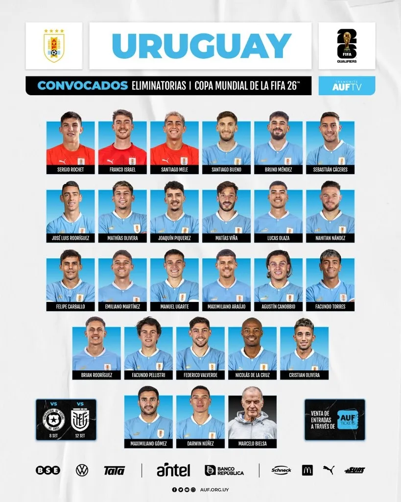 Luego de volver locos a los hinchas y periodistas de Uruguay, a cuatro días del debut por Eliminatorias para el Mundial 2026 ante Chile, finalmente Marcelo Bielsa entrega su nómina de jugadores convocados, sin la presencia de Luis Suárez.
