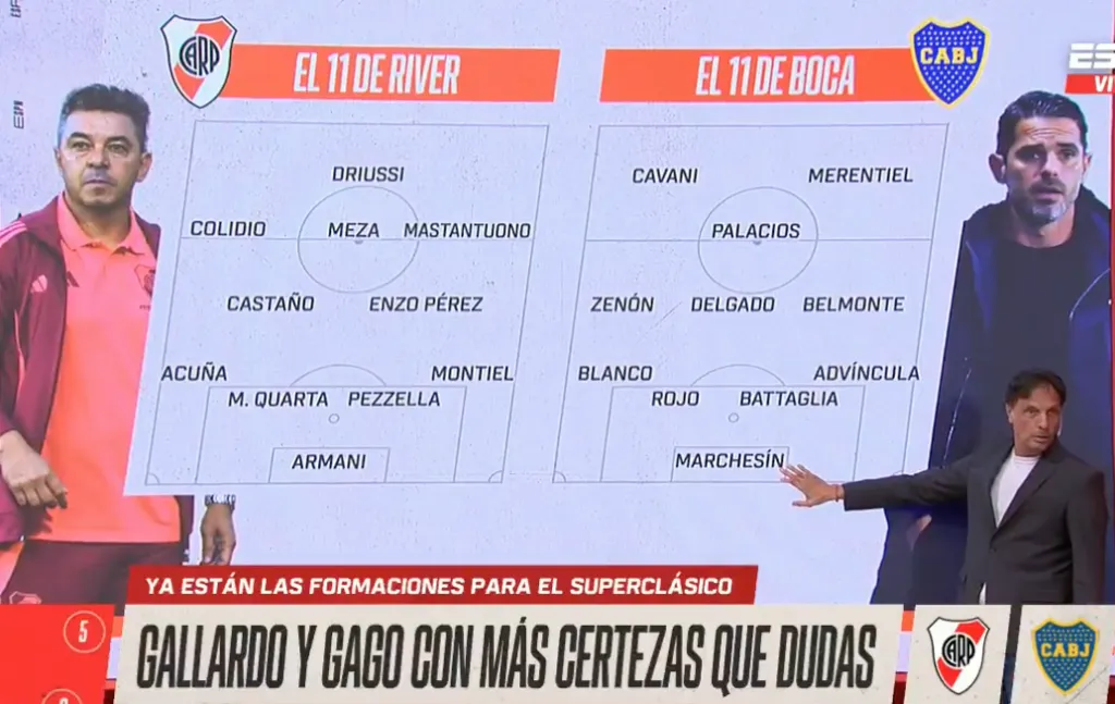 De esta forma la formación de Boca Juniors sería con Marchesín, Advíncula, Battaglia, Rojo y Blanco en defensa, Belmonte, Delgado, Zenón y Palacios en el medio, mientras que en ataque los ya mencionados Cavani y Merentiel.