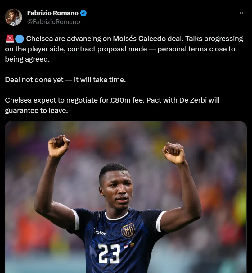 “Los términos personales están cerca de ser acordados. Pero el trato no se ha hecho todavía, llevará algo de tiempo”, informó Fabrizio Romano, infalible reportero en cuanto a mercado de fichajes se trata. “Por un pacto con De Zerbi, la salida de Caicedo está garantizada. Chelsea espera negociar una tarifa de 80 millones de libras esterlinas”, agregó.