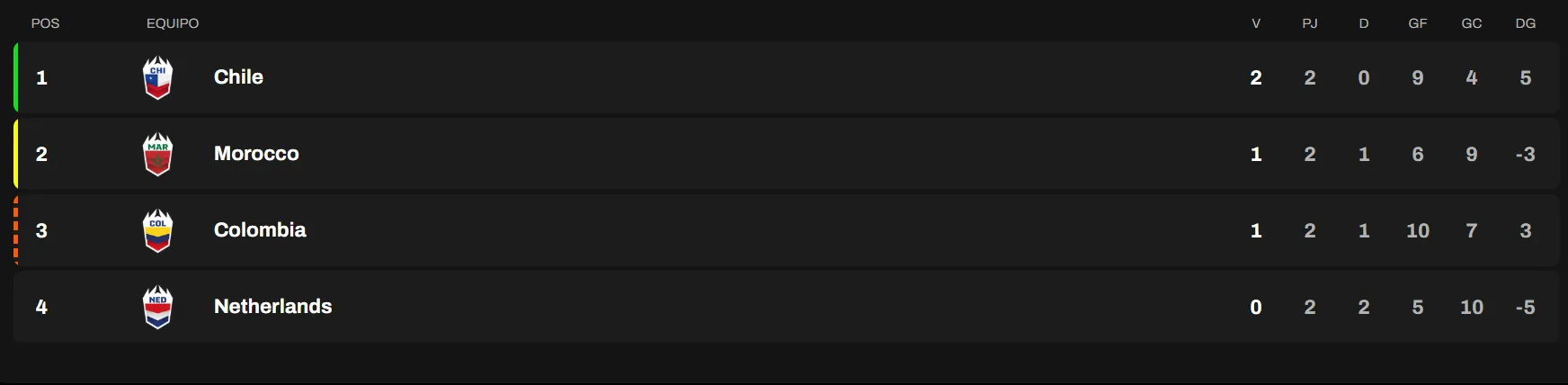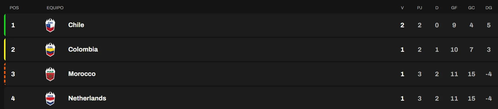 Chile venía de derrotar a Marruecos por 6-1 y triunfar contra Países Bajos en el debut con empate 3-3 y un 3-1 en los penales shootout. Con otra victoria ante Colombia se va a cuartos de final con canasta completa y de forma directa, evitando “the last chance”.