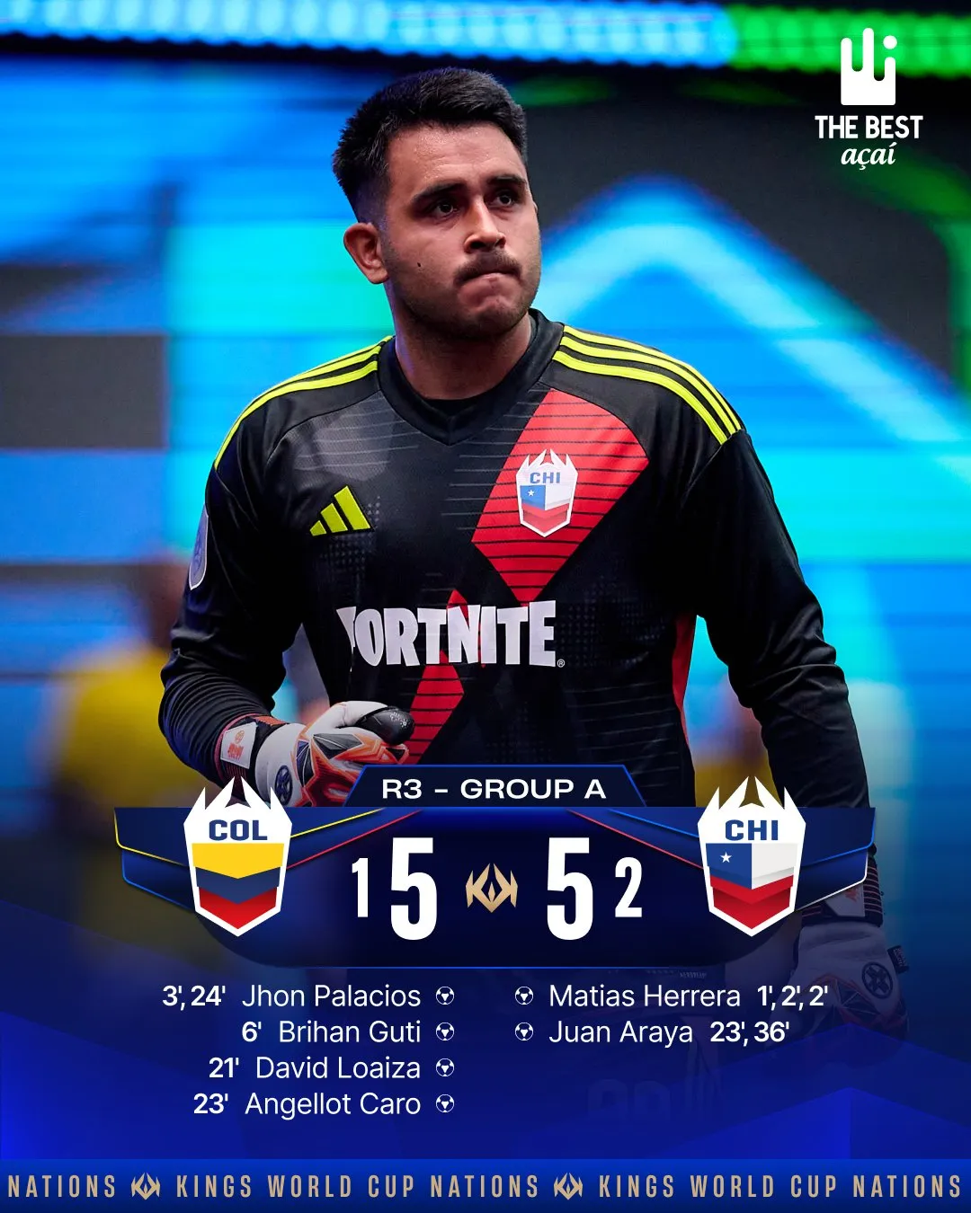 Chile tenía la primera opción y dependía de sí misma para clasificar a los cuartos de final de la Kings World Cup Nations 2006 de la Kings League y cumplió la tarea. Fue triunfo por 2-1 contra Colombia en los penales shootout, por la tercera y última fecha del Grupo A.
