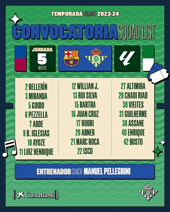 Junto a Bravo, Pellegrini tampoco podrá contar con Aitor Ruibal, William Carvalho y Nabil Fekir, saliendo también de recuperaciones, ni los lesionados Youssof Sabaly ni Andrés Guardado.