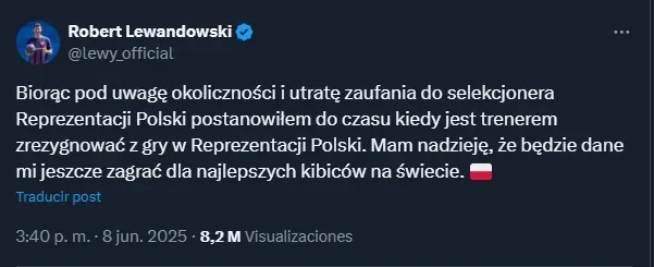 “Considerando las circunstancias y la pérdida de confianza en el entrenador de la selección polaca, decidí renunciar a jugar en la selección mientras que él sea el seleccionador”, lanzó el goleador en su cuenta de X, confirmara una grieta imposible de reparar.