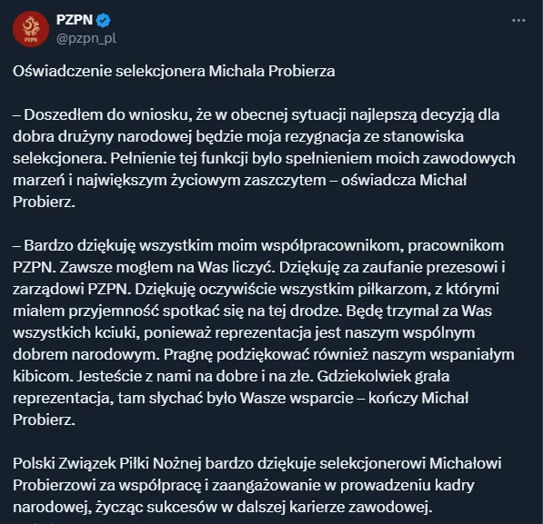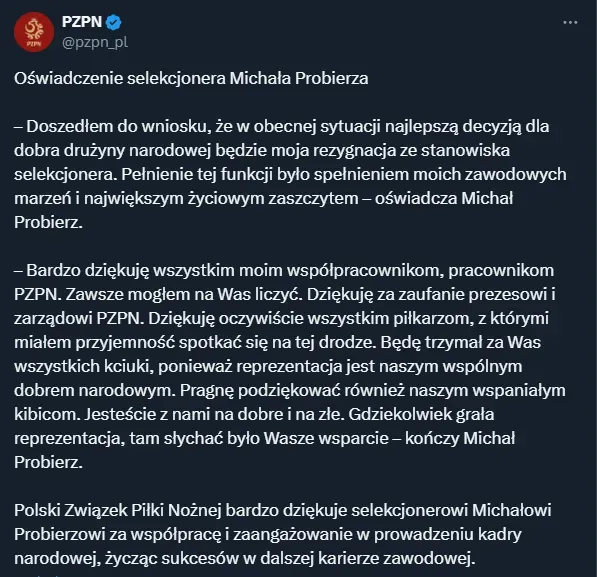 “He llegado a la conclusión de que, en la situación actual, la mejor decisión para el bien de la selección nacional sería mi dimisión como seleccionador. Desempeñar este cargo fue la realización de mis sueños profesionales y el mayor honor de mi vida”, dijo el ahora exentrenador, en un mensaje que compartió la federación polaca de fútbol.