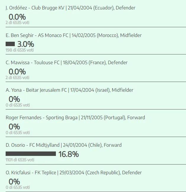 Hay varios otros jóvenes de mucha proyección que asoman en el listado de posibles elegidos. El español Pau Cubarsí, zaguero central del Barcelona, también está entre los candidatos. Y el alemán Youssoufa Moukoko, quien parecía tener todo acordado para incorporarse al Olympique de Marsella. Habrá que ver cómo termina el conteo. Tiempo para que Osorio repunte queda.