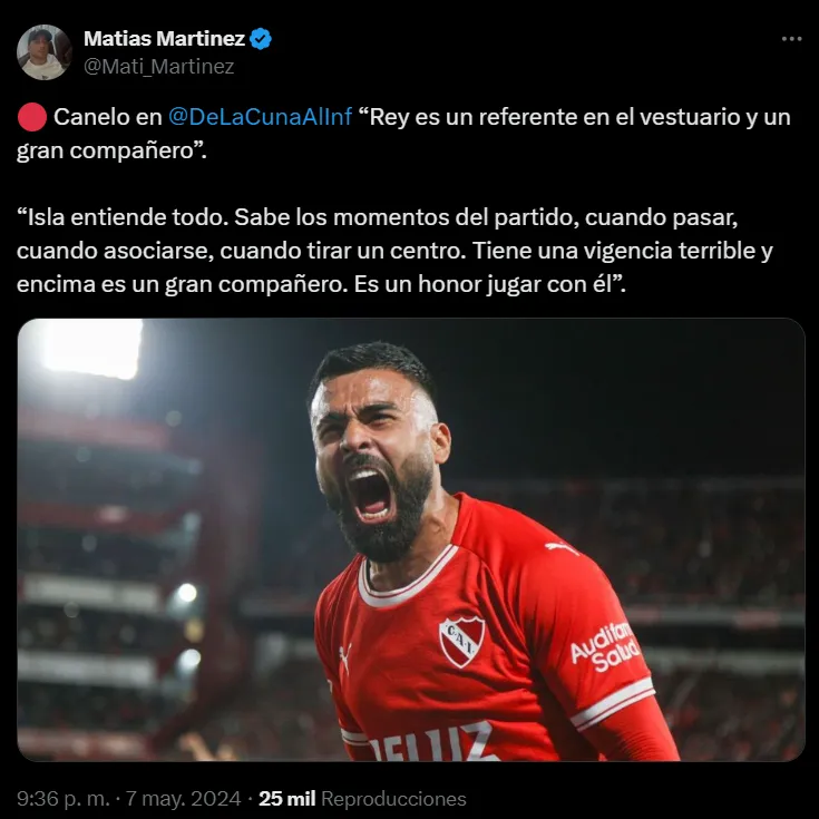 Por estos días apareció otra voz del Rojo para realzar las cualidades del experimentado carrilero de 35 años. Se trata de Alexis Canelo, un atacante de vasta experiencia en el fútbol mexicano que llegó al Rey de Copas. “Isla entiende todo. Sabe los momentos del partido”, aseguró el ariete en una conversación con De la Cuna al Infierno.