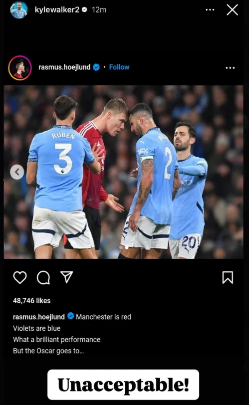 Esas referencias son para Kyle Walker, que provocó una amonestación para Hojlund con una conducta que el escandinavo reprochó. “Manchester es rojo, las violetas son azules. Qué brillante actuación, pero el Oscar va para…”, fue el mensaje que compartió el seleccionado de Dinamarca.