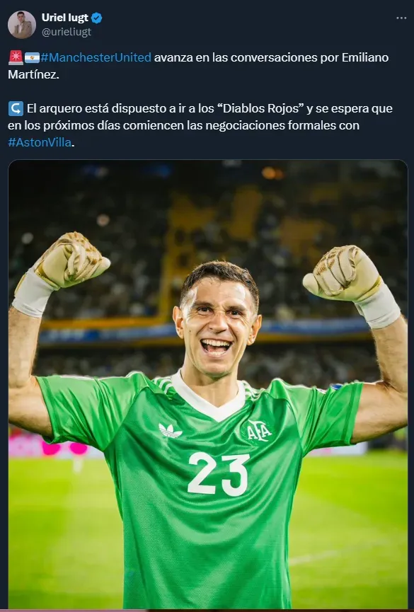 “Manchester United avanza en las conversaciones por Emiliano Martínez”, escribió Iugt en su cuenta de X, agregando que“el arquero está dispuesto a ir a los Diablos Rojos y se espera que en los próximos días comiencen las negociaciones formales con Aston Villa”.