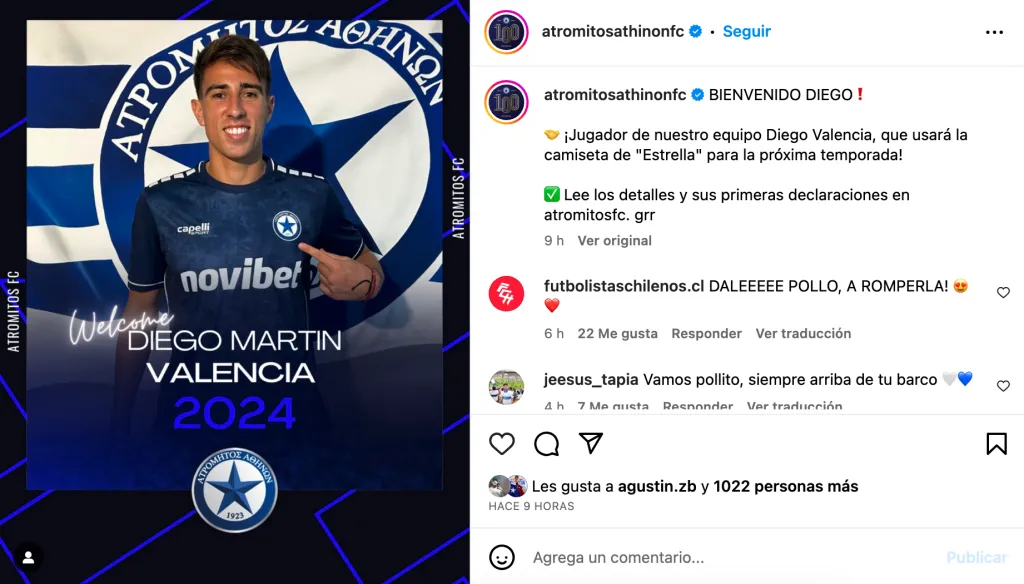Este sábado Valencia fue presentado de manera oficial en su nuevo equipo. Llegó cedido a préstamo por un año, hasta junio del 2024, y vestirá la camiseta número 18. El ex Universidad Católica se mostró emocionado por lo que viene este año en Grecia.