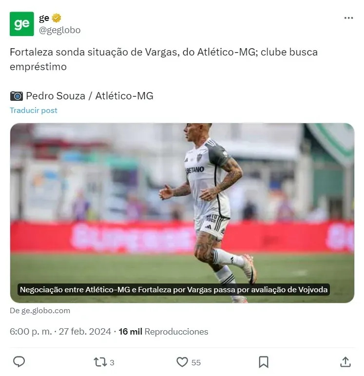 Según dio a conocer el portal Globoesporte, Atlético Mineiro está en negociaciones con Fortaleza para conseguir a Vargas, un hecho que cuenta con la aprobación de su entrenador Juan Pablo Vojvoda, ex DT de Unión La Calera.