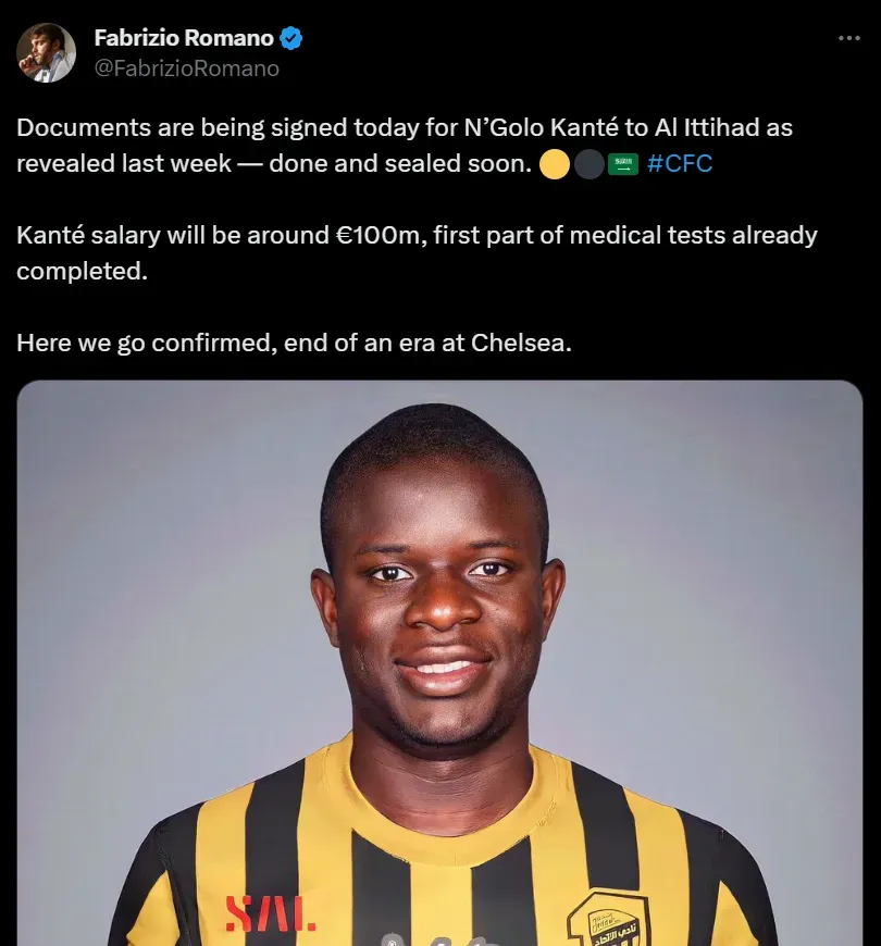 Ante aquel tema, el reputado periodista confirmó la tónica que se vislumbra en los traspasos hacia el fútbol de Arabia Saudita. “El sueldo de Kanté rondará los 100 millones de euros por temporada”, contó Romano. En ese salario están incluidos los derechos de imagen y acuerdos comerciales. Firmará un contrato de dos campañas.