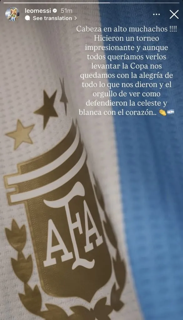 “¡Cabeza en alto, muchachos! Hicieron un torneo impresionante y aunque todos queríamos verlos levantar la Copa, nos quedamos con la alegría de todo lo que nos dieron y el orgullo de ver cómo defendieron la celeste y blanca con el corazón”, escribió en Instagram.