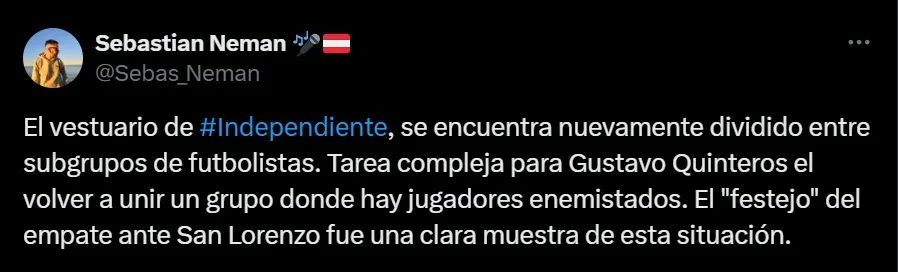 El comunicador Sebastián Neman escribió en sus redes que: “El vestuario de #Independiente, se encuentra nuevamente dividido entre subgrupos de futbolistas. Tarea compleja para Gustavo Quinteros el volver a unir un grupo donde hay jugadores enemistados. El “festejo” del empate ante San Lorenzo fue una clara muestra de esta situación