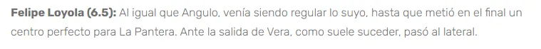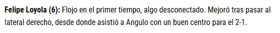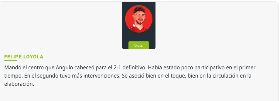 Finalmente, Orgullo Rojo le dio la nota más alta hasta el momento, con un 6,5, resaltando el cambio antes mencionado: jugando mejor de lateral. “Al igual que Angulo, venía siendo regular lo suyo, hasta que metió en el final un centro perfecto para La Pantera”, dijeron.