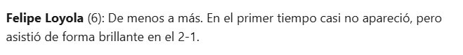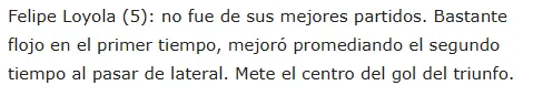 Así también lo entendieron al otro lado de la cordillera, porque el mundo del fútbol tampoco quedó al margen de la labor de Felipe Loyola en dicho partido, asistiendo para el 2-1 con el que triunfaron ante el cuadro de Mendoza.