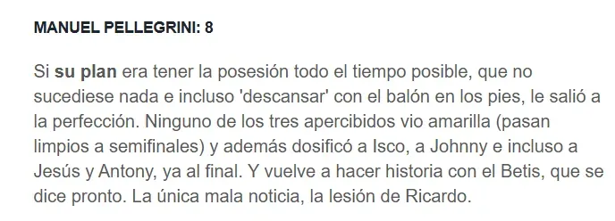 Por ejemplo, Estadio Deportivo le dio una nota 8 a la labor del Ingeniero en el partido de Conference League, al nivel de Bakambú, “empeñado en ser el héroe verdiblanco”. De hecho, de Pellegrini dijeron: “Si su plan era tener la posesión todo el tiempo posible, que no sucediese nada e incluso ‘descansar’ con el balón en los pies, le salió a la perfección“.