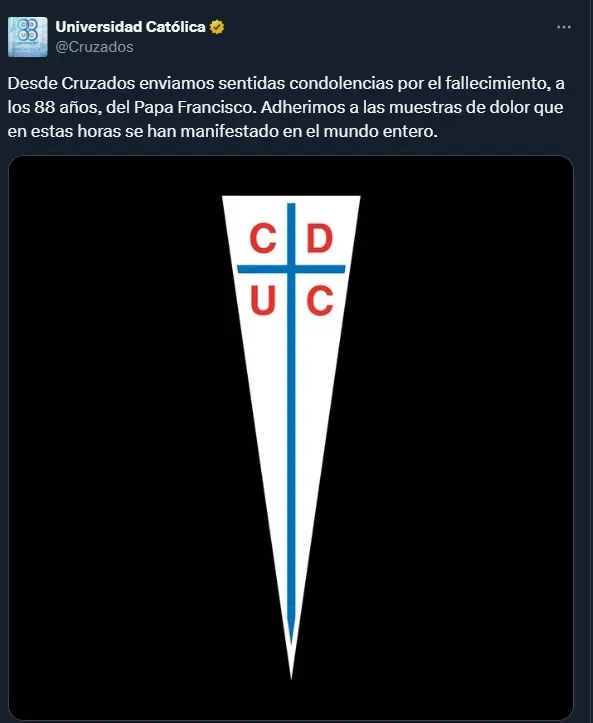 En Chile, por ejemplo, fueron dos clubes de la Liga de Primera quienes en redes sociales despidieron al Papa Francisco. Por un lado, Universidad Católica envió sus condolencias y se adhirieron a las muestras de dolor por la partida del Sumo Pontífice.