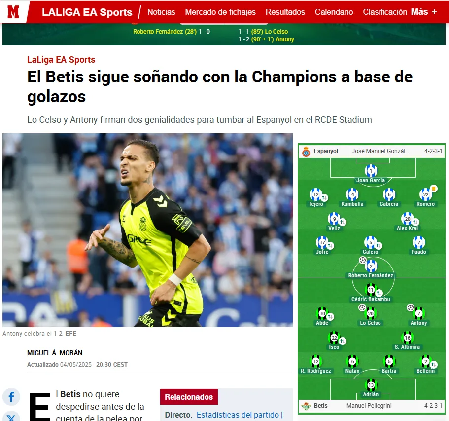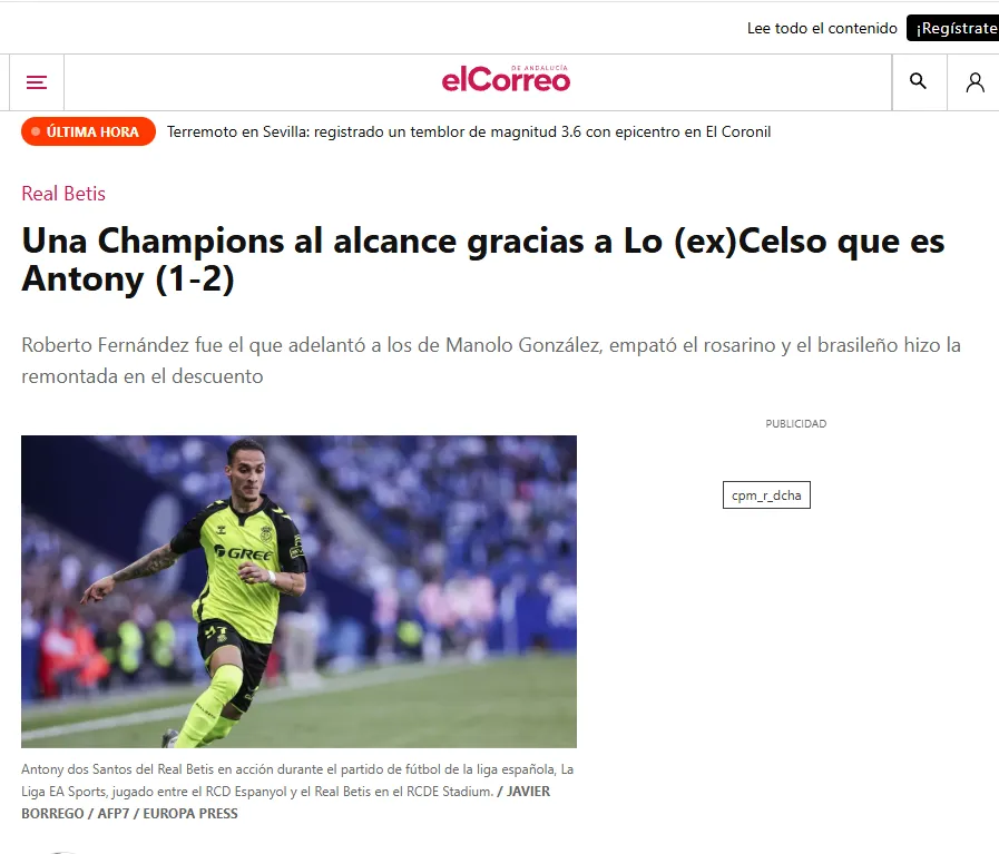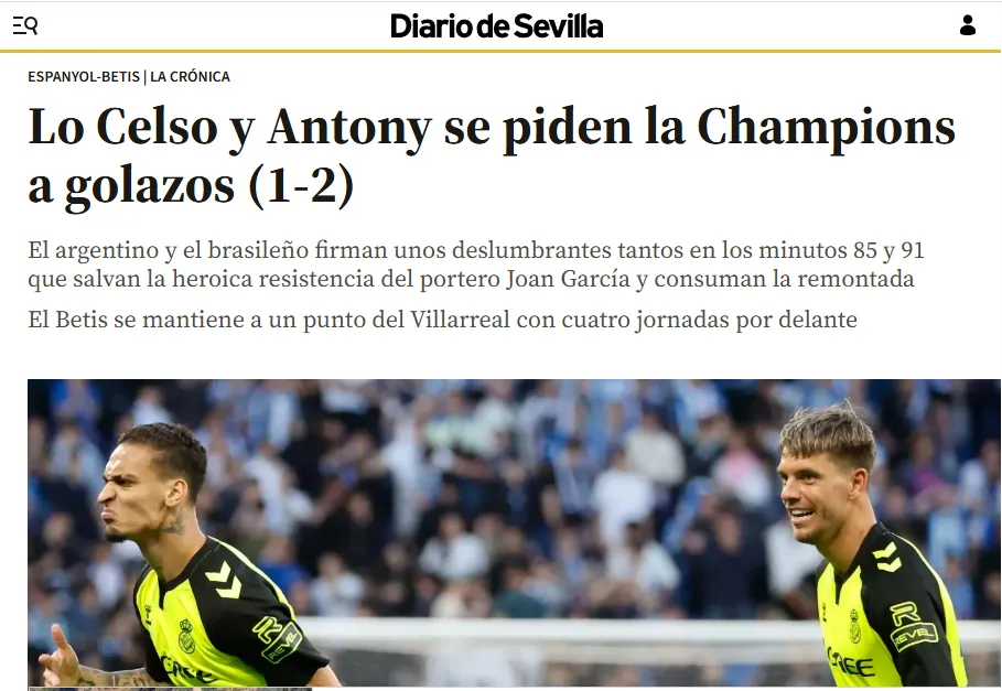 El Correo de Andalucía alabó la épica conseguida por el cuadro de Manuel Pellegrini. “Una Champions al alcance gracias a Lo (ex)Celso que es Antony”, tituló el citado portal. “Quedaba un mago por aparecer, Antony, que se había desgañitado de todas las maneras y sacó su mejor truco”, resaltaron.