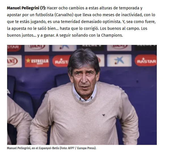 Finalmente, El Desmarque calificó con nota 7 al Ingeniero, destacando la valentía de hacer ocho cambios para enfrentar un partido clave por la Liga de España, y que le resulte. “Los buenos al campo. Los buenos juntos… y a ganar. A seguir soñando con la Champions”, remató el medio sevillano.