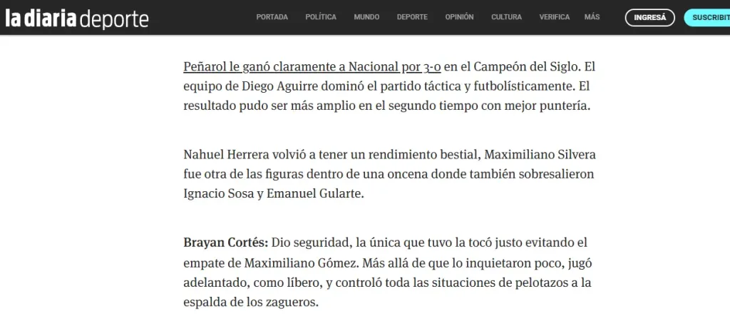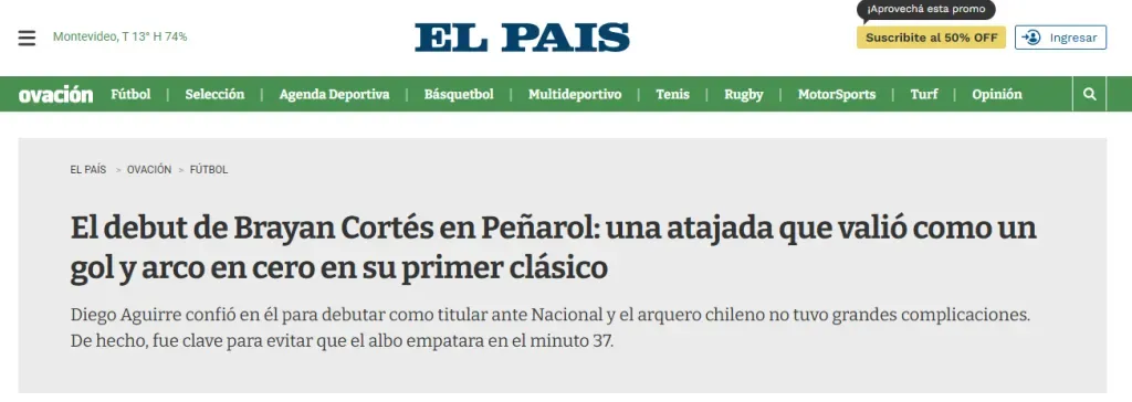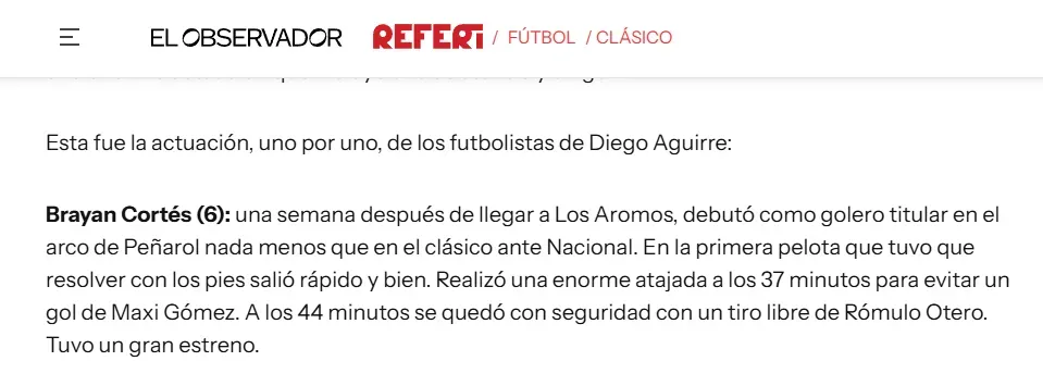 Por ejemplo, El País, uno de los más reconocidos del otro lado del Río de La Plata, le dedicó un artículo especial. “El debut de Brayan Cortés en Peñarol: una atajada que valió como un gol y arco en cero en su primer clásico”, titularon.