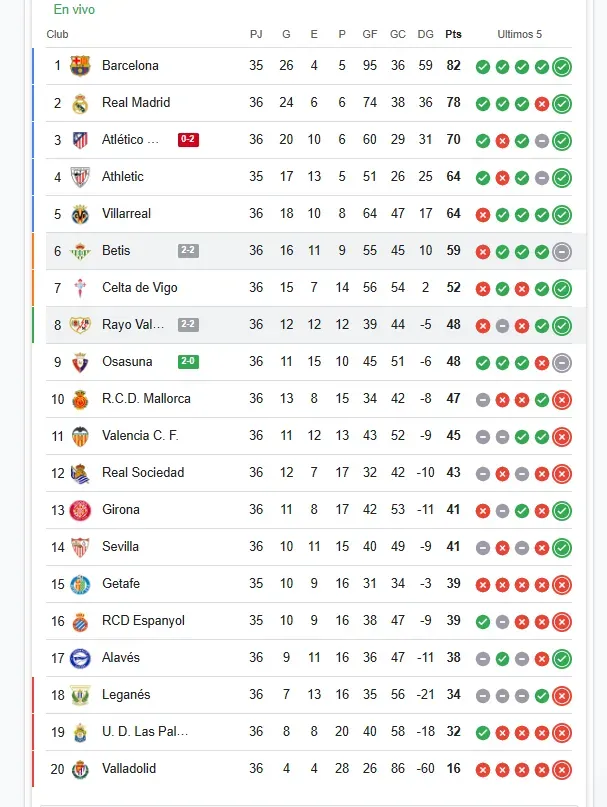 Son cinco puntos de diferencia para el conjunto del Ingeniero respecto al Villarreal, con dos fechas por jugar. La próxima fecha el verdiblanco tiene que visitar al Atlético de Madrid para mantener las chanches.