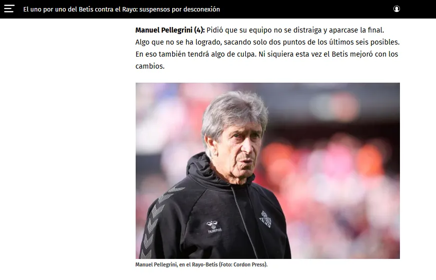 De hecho, calificaron con nota 4 la labor de Manuel Pellegrini en la igualdad. “Pidió que su equipo no se distraiga y aparcase la final. Algo que no se ha logrado, sacando solo dos puntos de los últimos seis posibles. En eso también tendrá algo de culpa“, sentenció el medio.