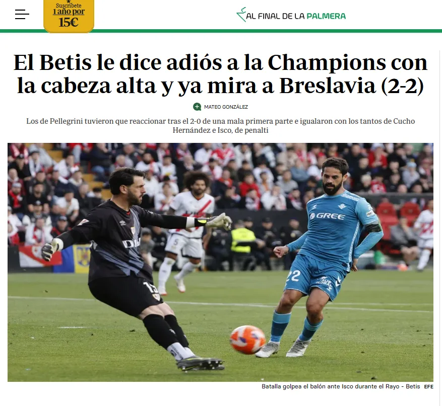 Por otro lado, Al Final de la Palmera dice que el Betis “dice adiós a la Champions con la cabeza alta y ya mira a Breslavia”, en relación a la final de la Conference League ante Chelsea. “El Betis se despidió del sueño de la Champions en Vallecas. Garantizó (…) acabar sexto pero lo tiene prácticamente imposible para ser quinto“, agregaron.