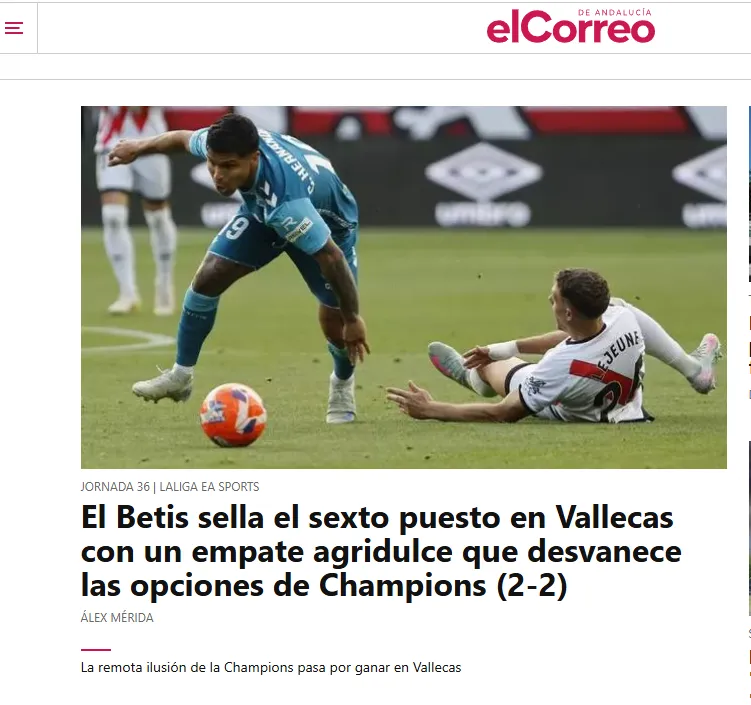 El Correo de Andalucía tituló como “empate agridulce que desvanece las opciones de Champions” por parte del Betis. “La personalidad que nunca pierden, y el talento de algunos, valió para lograr un empate que certifica el sexto puesto pero que deja las opciones de Champions League casi disipadas”, comentaron.
