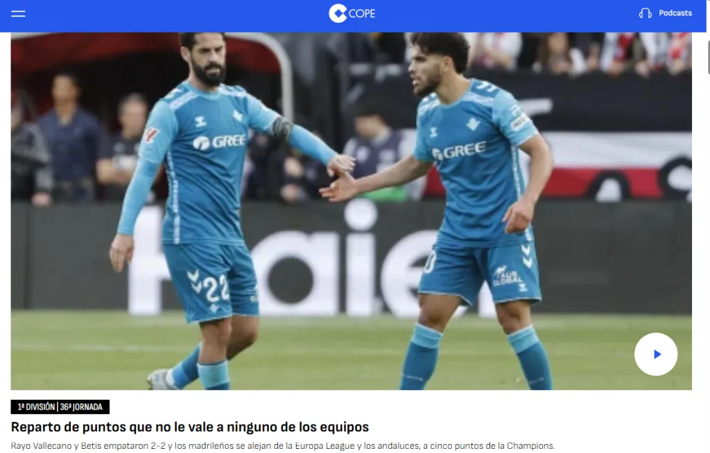 Finalmente, Cadena Cope puso énfasis a ambos elencos. “Reparto de puntos que no le vale a ninguno de los equipos”, señalaron. “En el caso de los verdiblancos, les frena en su pelea por la Liga de Campeones”, escribieron.