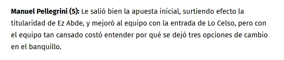 El Desmarque, por otro lado, calificó con nota 5 para el técnico chileno. “Le salió bien la apuesta inicial, surtiendo efecto la titularidad de Ez Abde, y mejoró al equipo con la entrada de Lo Celso”, escribieron. Aún así, el medio cuestiona que “con el equipo tan cansado costó entender por qué se dejó tres opciones de cambio en el banquillo”.