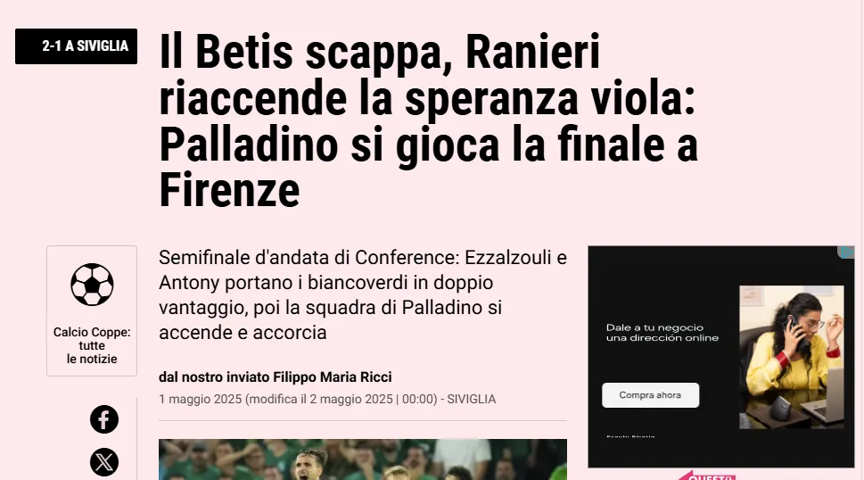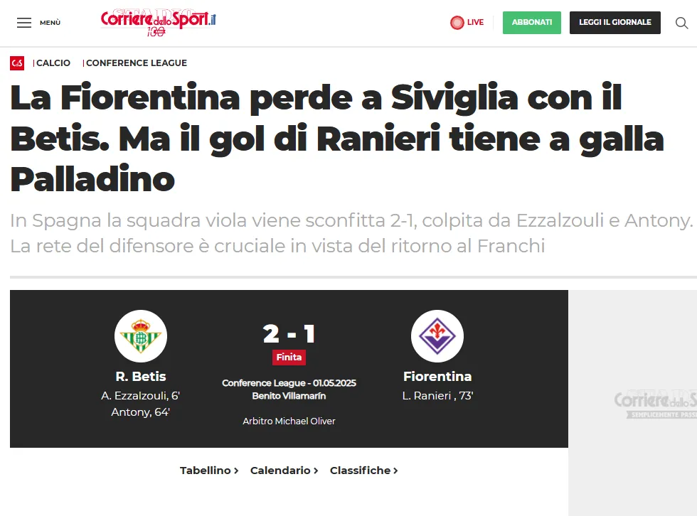 Mientras que en Italia tampoco quedaron abajo a las reacciones para el 2-1 del Betis. La Gazzetta dello Sport señaló que pese a la derrota de la Fiorentina, “Ranieri reaviva las esperanzas violas”. “En un eléctrico y expectante Benito Villamarín pierde 2-1 cortando la racha de 9 resultados útiles pero regresa a Florencia consciente de ser capaz de remontar la semifinal“, escribieron.