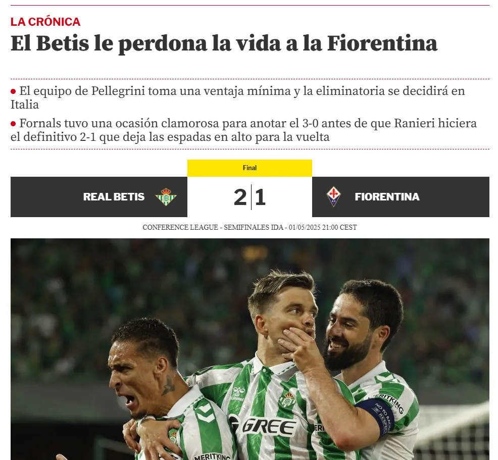Mundo Deportivo comentó que “el Betis le perdona la vida a la Fiorentina”, pero también destacó a los andaluces. “Llega a este decisivo tramo final de la temporada en un excelente momento de forma y desde el pitido inicial impuso un ritmo endiablado que muy pronto sorprendió a la Fiore”, señalaron.