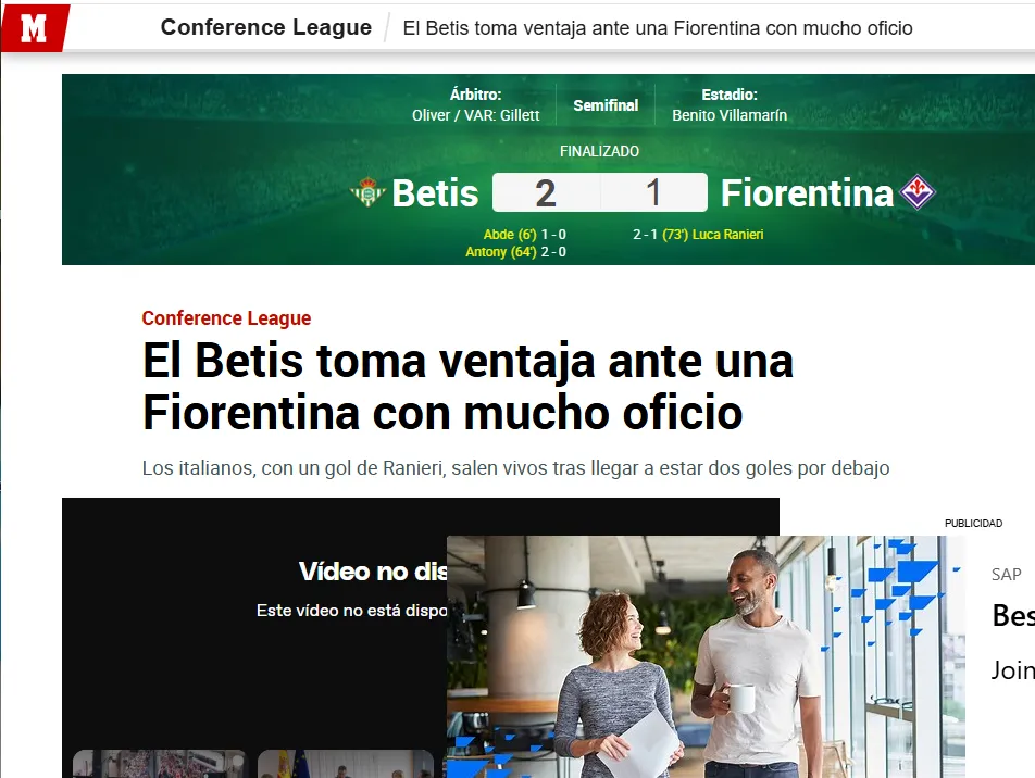 Marca tituló el comentario del partido de la siguiente forma: “El Betis toma ventaja ante una Fiorentina con mucho oficio”. Además, comentaron que “los italianos salen ‘vivos’ de un partido en el que sufrieron muchísimo”, destacando que “el talento de Isco, Antony y Lo Celso marca diferencias”, para el Ingeniero.