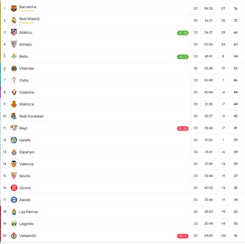 Con el 5-1 conseguido por Manuel Pellegrini y Real Betis, el cuadro del Ingeniero terminó en la quinta posición de la Liga de España, con 54 puntos, en zona de clasificación directa a la Champions League del 2025/26.