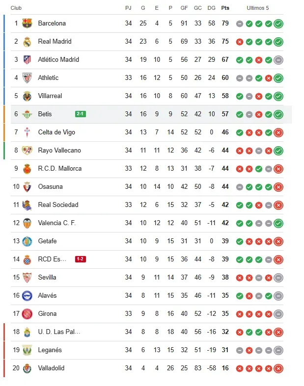 Así queda la tabla de posiciones en la Liga de España: El sueño de Pellegrini sigue
