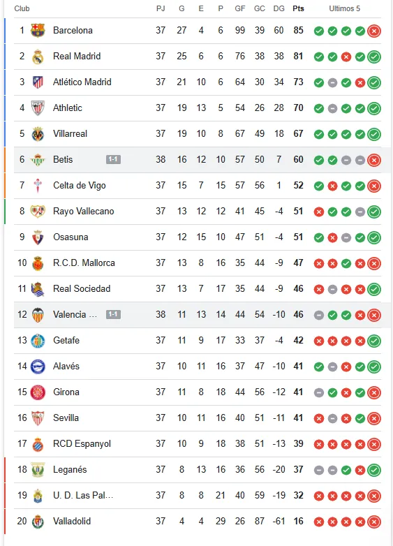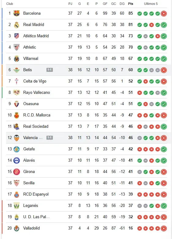 Así quedó la tabla de posiciones de la Liga de España con el empate del Betis
