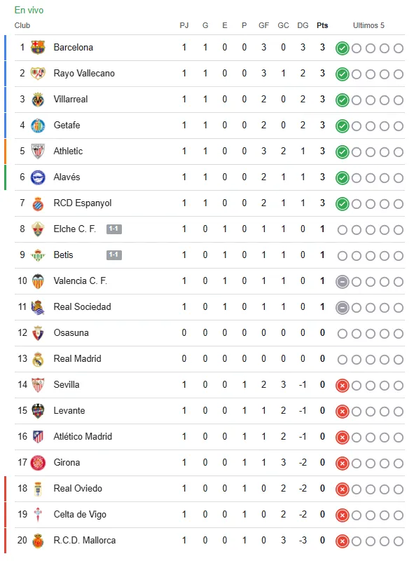 Ya con el resultado consumado, así queda la tabla de posiciones de la Liga de España a falta de un partido que protagonizan Osasuna vs Real Madrid, este martes 19 de agosto a las 15:00 hrs.