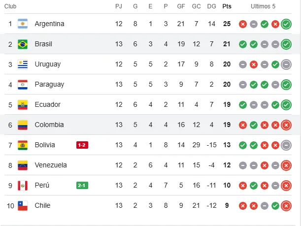 Con el resultado, Brasil se mete en la tabla de posiciones y quedó en la segunda ubicación con 21 puntos, a cuatro de Argentina, mientras que Colombia se queda en la sexta ubicación con 19 positivos.