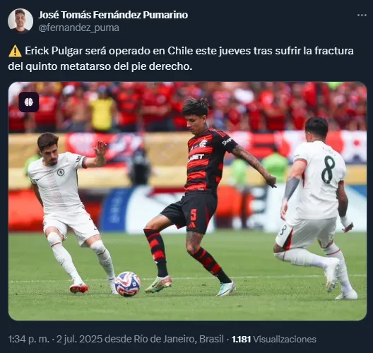 “Erick Pulgar será operado en Chile“, señaló el también comunicador de Radio La Clave. Dicho procedimiento será este jueves 3 de julio, y agregan que el jugador está descartado de plano por un mes y medio.