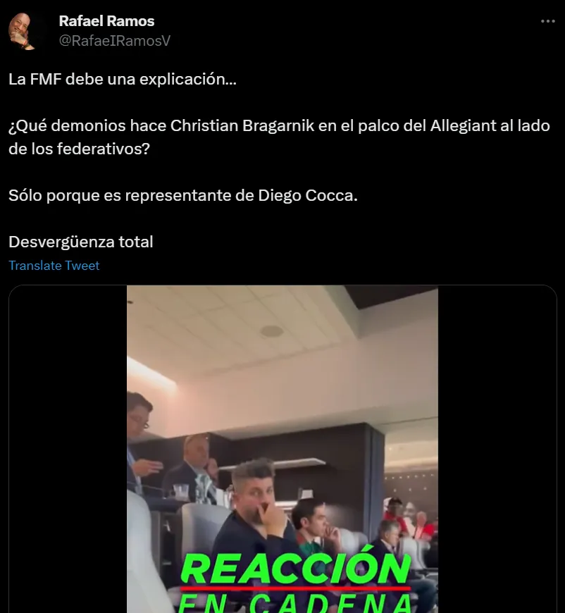Rafael Ramos no dejó pasar la oportunidad de pegarle un palazo a los directivos de la FMF. “¿Qué demonios hace Christian Bragarnik en el palco del Allegiant al lado de los federativos?”, tuiteó el comunicador que trabaja para ESPN.