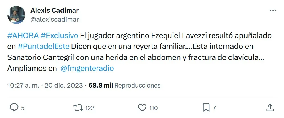 En la actualidad, Lavezzi está en observación en el centro médico de Punta del Este, acompañado por dos mujeres, y de acuerdo con Infobae, “manifestó su intención de volver a Argentina y pidió un avión para concretar el traslado”.