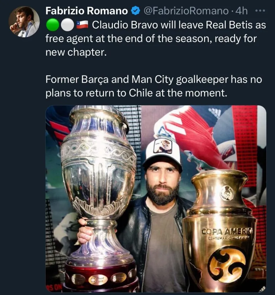 “Claudio Bravo dejará el Real Betis como agente libre al final de la temporada, listo para un nuevo capítulo”, comentó en su Twitter personal, con una foto del meta y las dos Copa América que levantó con la Roja.