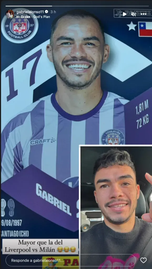 Con una imagen del locker de Toulouse, con menos pelo que en la actualidad, Gaby exhibió una foto actual, con la canción God’s Plan del canadiense Drake, y aseguró que el crecimiento de pelo es una remontada “mayor que la del Liverpool ante Milan”, con emojis de risa incluidos.